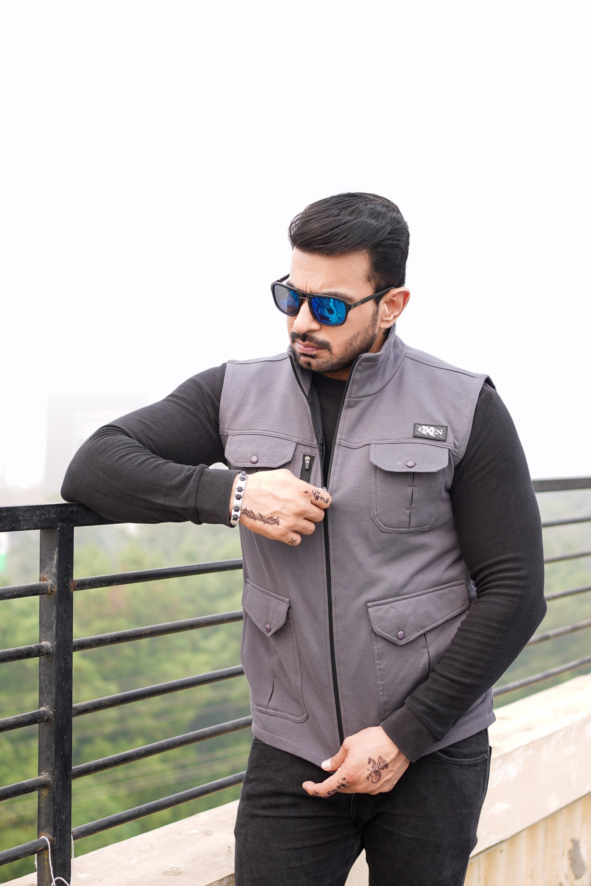 Premium Cotton Fleece Four Pocket sleeveless Jacket Grey Jkt-02